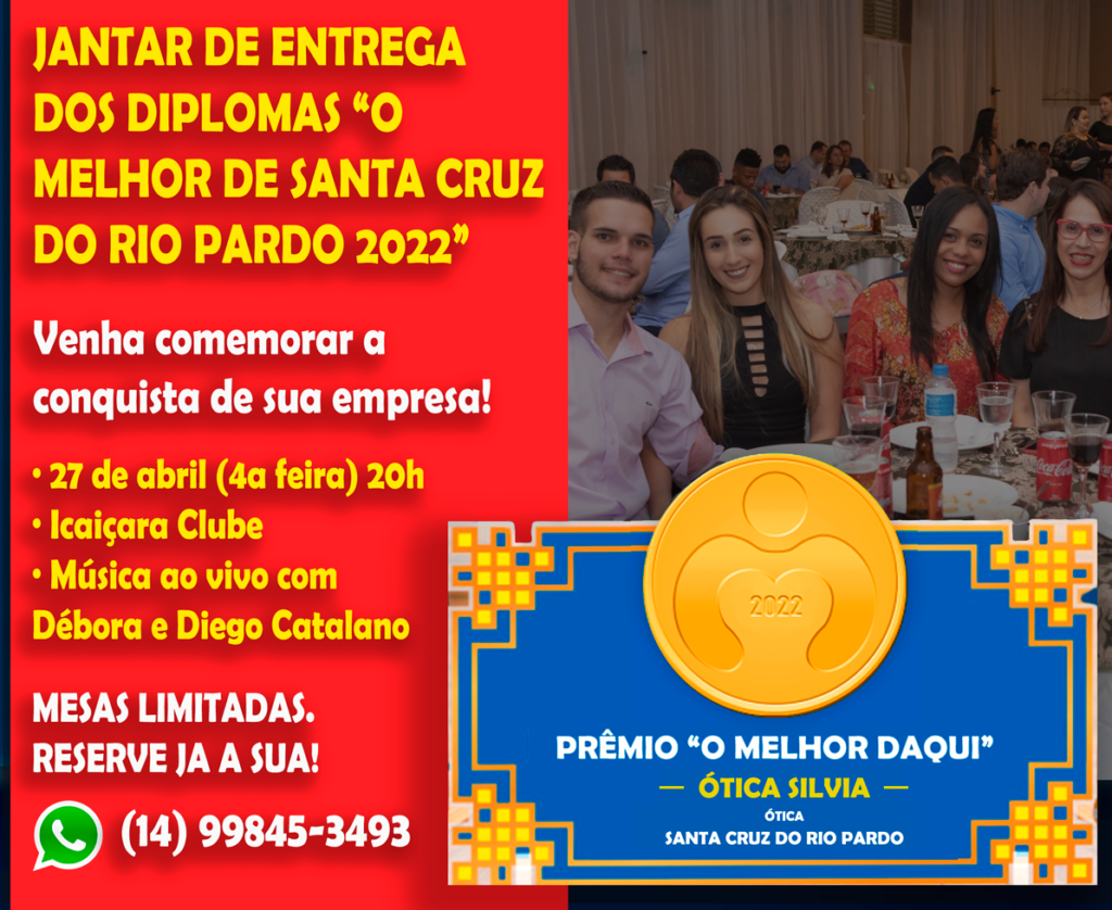 Receba o diploma personalizado Ouro, Prata ou Bronze conquistado por sua empresa em nosso Jantar de Confraternização, no dia 27 de abril de 2022, a partir das 20h, no Icaiçara Clube. O evento terá jantar servido pelo Buffet Stringues (bebidas não incluídas no valor da mesa) e música ao vivo com Débora e Diego Catalano.